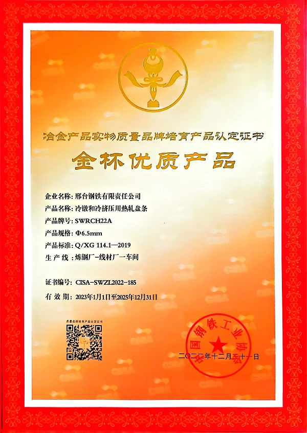 冷鐓和冷擠壓用精品盤(pán)條SCM435φ23mm;φ14-φ16mm規(guī)格獲冶金產(chǎn)品實(shí)物質(zhì)量金杯優(yōu)質(zhì)產(chǎn)品認(rèn)定證書(shū)
