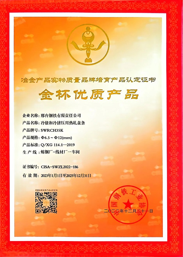 冷鐓和冷擠壓用熱軋盤(pán)條SWRCH35Kφ6.5-φ12mm規(guī)格獲冶金產(chǎn)品實(shí)物質(zhì)量金杯優(yōu)質(zhì)產(chǎn)品認(rèn)定證書(shū)