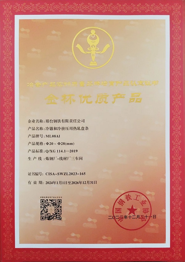 冷鐓和冷擠壓用熱軋盤(pán)條ML08Alφ20-φ28mm規(guī)格獲冶金產(chǎn)品實(shí)物質(zhì)量金杯優(yōu)質(zhì)產(chǎn)品認(rèn)定證書(shū)