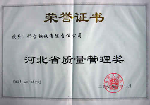 2009年12月,邢鋼榮獲“2009年河北省企業(yè)管理創(chuàng)新優(yōu)勝企業(yè)”榮譽(yù)稱號。