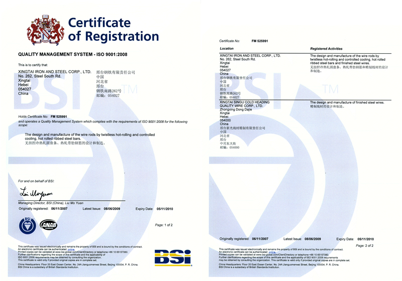2007年8月24日,邢鋼獲ISO/TS 16949:2002認(rèn)證證書(國(guó)際汽車行業(yè)質(zhì)量管理體系認(rèn)證)。