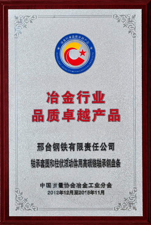 - 近期,中國(guó)鋼鐵協(xié)會(huì)認(rèn)定133個(gè)產(chǎn)品的實(shí)物質(zhì)量達(dá)到了國(guó)際同類(lèi)產(chǎn)品實(shí)物水平,授予2012年度冶金產(chǎn)品實(shí)物質(zhì)量“金杯獎(jiǎng)”,頒發(fā)了榮譽(yù)證書(shū)。邢鋼公司生產(chǎn)的規(guī)格φ5.5-16mm 軸承鋼盤(pán)條GCr15 在獲得“冶金行業(yè)品質(zhì)卓越產(chǎn)品”后,又榮獲此榮譽(yù)。