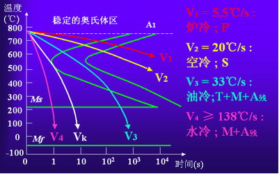 等溫轉(zhuǎn)變“TTT曲線”在連續(xù)冷卻轉(zhuǎn)變中的應(yīng)用:由于連續(xù)冷卻“CCT轉(zhuǎn)變曲線”的測(cè)定較為困難,而連續(xù)冷卻轉(zhuǎn)變可以看作由許多溫度相差很小的等溫轉(zhuǎn)變過(guò)程所組成的,所以連續(xù)冷卻轉(zhuǎn)變得到的組織可認(rèn)為是不同溫度下等溫轉(zhuǎn)變產(chǎn)物的混合物。故生產(chǎn)中常用TTT曲線(C曲線)近似地分析連續(xù)冷卻過(guò)程。下圖中V1(爐冷)、V2(空冷)、V3(油冷)、V4(水冷)代表熱處理中四種常用的連續(xù)冷卻方式。