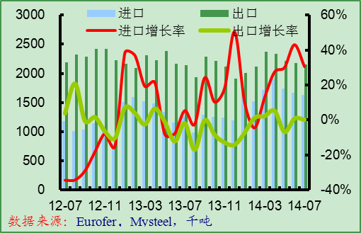 8月份歐洲粗鋼日均產(chǎn)量為48.9萬噸,環(huán)比下降7%,同比增長(zhǎng)2.8%,需求季節(jié)性下降所致。9月份歐洲需求季節(jié)性復(fù)蘇,預(yù)計(jì)粗鋼日均產(chǎn)量將環(huán)比回升。7月份歐盟出口鋼材215萬噸,同比增長(zhǎng)0.2%,進(jìn)口鋼材163萬噸,同比增長(zhǎng)31%,凈出口量52萬噸,同比下降42%,環(huán)比持平。9月份歐元兌美元大幅貶值,歐洲鋼廠的進(jìn)口壓力明顯緩解,而出口競(jìng)爭(zhēng)力得到加強(qiáng),預(yù)計(jì)四季度歐洲鋼材凈出口量將環(huán)比大幅回升。