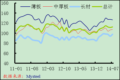 7月份德國(guó)中間商庫存小幅回升,在產(chǎn)量環(huán)比下降和凈出口環(huán)比持平的情況下,庫存上升表明鋼材需求明顯萎縮。分品種來看,薄板庫存小幅下降,而長(zhǎng)材和中厚板庫存上升明顯。