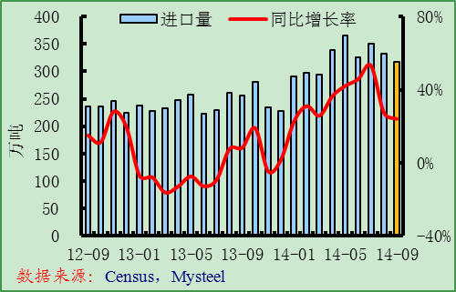 8月份美國(guó)鋼材進(jìn)口量為333萬噸,同比增長(zhǎng)27.4%,但環(huán)比下降5%。分品種看,與去年8月份相比,主要品種進(jìn)口量均實(shí)現(xiàn)增長(zhǎng),依然是冷軋、鍍鋅板與中厚板的進(jìn)口量增長(zhǎng)最明顯,其中中厚板增長(zhǎng)114%,冷軋?jiān)鲩L(zhǎng)65.7%,鍍鋅板增長(zhǎng)46.1%。與今年7月份比,除半成品、長(zhǎng)材、線材和螺紋鋼進(jìn)口量環(huán)比增長(zhǎng)外,其他品種均環(huán)比下降,其中螺紋鋼增長(zhǎng)最快,為191.5%。最新的統(tǒng)計(jì)數(shù)據(jù)顯示,截至到2014年9月24日,9月份美國(guó)鋼材進(jìn)口許可證數(shù)為317萬噸,高于去年9月水平,與8月份同期數(shù)據(jù)基本持平,預(yù)計(jì)今年9月份美國(guó)鋼材進(jìn)口量同比仍將大幅增加,環(huán)比基本持平或略有增長(zhǎng)。