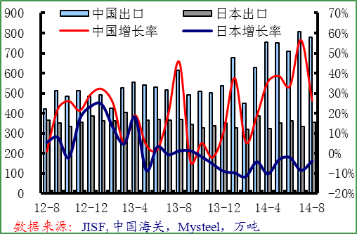 8月份中國(guó)鋼材出口778萬噸,同比增長(zhǎng)26.4%,環(huán)比下降3.7%。9月份中國(guó)鋼材市場(chǎng)大幅下滑,鋼材出口進(jìn)一步增強(qiáng),PMI調(diào)查也顯示出口訂單增長(zhǎng),預(yù)計(jì)9月份中國(guó)鋼材出口依然保持在高水平。8月日本鋼鐵出口量為356萬噸,同比下降3.8%,環(huán)比增長(zhǎng)6.7%,主要是日元貶值帶動(dòng)。9月份日元大幅貶值,日本鋼材出口競(jìng)爭(zhēng)力再次加強(qiáng),預(yù)計(jì)出口量將繼續(xù)環(huán)比增長(zhǎng)。