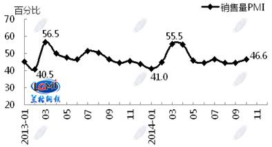 =鋼鐵市場(chǎng)活躍度略有好轉(zhuǎn)。10月銷(xiāo)售量指數(shù)為46.6%,較上月上升2.1個(gè)百分點(diǎn)(見(jiàn)圖3),表明10月份鋼貿(mào)企業(yè)銷(xiāo)售量增加,鋼鐵流通市場(chǎng)活躍度略有好轉(zhuǎn)。進(jìn)入10月,隨著鋼鐵原料鐵礦石及鋼坯價(jià)格的先漲后跌,鋼材市場(chǎng)價(jià)格也呈現(xiàn)先漲后跌走勢(shì),市場(chǎng)成交總體有所好轉(zhuǎn)。從區(qū)域看,六大區(qū)域銷(xiāo)售量指數(shù)除東北、西北地區(qū)有所下降外,其余地區(qū)均出現(xiàn)不同程度的回升。