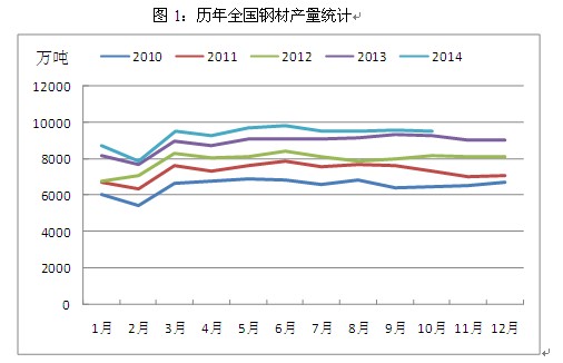 其一,鋼材產(chǎn)量增速有所回落。根據(jù)統(tǒng)計(jì),2014年1-10月,我國粗鋼產(chǎn)量68535萬噸,同比增長2.1%,增速同比減緩7.1個(gè)百分點(diǎn);鋼材產(chǎn)量93447萬噸,增長4.7%,減緩6.9個(gè)百分點(diǎn),國家政策的導(dǎo)向在這其中起了主要作用。一方面,2014年我國從政策上嚴(yán)格限制了鋼鐵等產(chǎn)能過剩行業(yè)的投資,由此導(dǎo)致除新疆地區(qū)外,其余省份全年均無高爐新建計(jì)劃,鋼鐵新增產(chǎn)能被控制;另一方面,京津冀地區(qū)持續(xù)霧霾天氣引發(fā)了公眾普遍擔(dān)憂,作為全國鋼鐵生產(chǎn)基地的河北省不時(shí)由于環(huán)境污染而被強(qiáng)制采取限產(chǎn)措施,雖然對于環(huán)保排污設(shè)施較為齊全的大型鋼廠影響有限,但中小型鋼廠的生產(chǎn)卻受到了較為明顯的影響,全國鋼材整體產(chǎn)量增速下滑也就變得順理成章