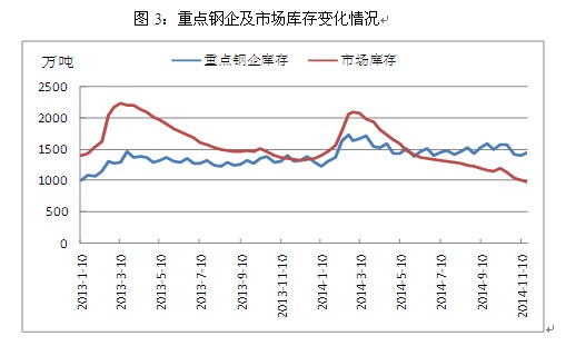 其三,鋼廠經(jīng)營風(fēng)險(xiǎn)有所上升。由于近兩年鋼價(jià)持續(xù)大幅下跌,市場上的鋼貿(mào)商苦不堪言,相較于家大業(yè)大且有地方政府扶持的鋼廠,鋼貿(mào)商的日子更加難熬,在持續(xù)虧損以及資金壓力下,超半數(shù)鋼貿(mào)商選擇退出。依然活躍于市場的鋼貿(mào)商在操作上也不復(fù)以往的大開大合,小心謹(jǐn)慎成為了多數(shù)鋼貿(mào)商的選擇,由此帶來的直接后果就是市場庫存向鋼廠庫存轉(zhuǎn)移。截止2014年10月末,全國主要城市鋼材庫存約為1043萬噸,較2013年同期相比大幅下降25.7%,與之相反的是,此時(shí)重點(diǎn)鋼企庫存增加到1414.3萬噸,較2013年同期上升9.8%,隨著鋼貿(mào)商 “蓄水池”功能的減弱,鋼廠對于價(jià)格調(diào)整以及生產(chǎn)策略的變動(dòng)將更為敏感,但與此同時(shí)鋼廠也將承擔(dān)更大的經(jīng)營風(fēng)險(xiǎn)。