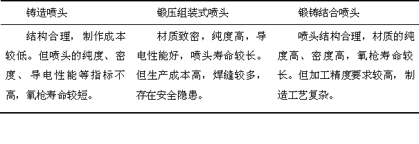 因?yàn)槔郀柨仔途哂斜容^高的射流速度,所以氧槍噴頭一般都采用拉瓦爾孔型。為了便于制作擴(kuò)張段,均簡化為圓錐形。在最近幾年的不斷進(jìn)化中,甚至還出現(xiàn)了“突擴(kuò)”、“旋轉(zhuǎn)”等特殊孔型。按氧槍噴頭的制造方法,氧槍可分為鑄造噴頭、鍛壓組裝式噴頭及鍛鑄結(jié)合噴頭,三種噴頭特點(diǎn)下表所示。
