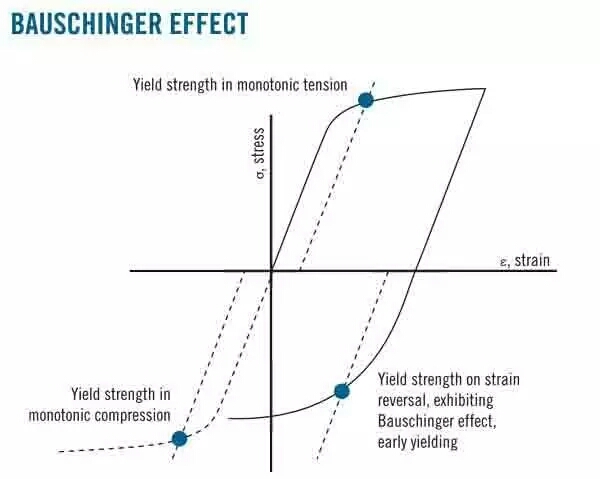 金屬材料經(jīng)過預先加載產(chǎn)生少量塑性變形(殘余應變?yōu)?%~2%),卸載后再同向加載,規(guī)定殘余應力(彈性極限或屈服強度 )增加;反向加載,規(guī)定殘余應力降低(特別是彈性極限在反向加載時幾乎降低到零)的現(xiàn)象,稱為包申格效應。