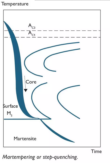 如今,用于合金鋼的淬火介質(zhì)有:硬化油、聚合物溶液、空氣和惰性氣體??諝庥不A粲糜诰哂懈叽阃感缘匿?,這在大多數(shù)情況下主要?dú)w因于錳、鉻和鉬的組合存在于鋼中。通過(guò)階梯淬火或者分級(jí)淬火可以減少變形和硬化裂紋的風(fēng)險(xiǎn)。在該方法中,材料在兩個(gè)步驟中淬火。首先,將其從硬化溫度冷卻直到表面的溫度剛好高于Ms溫度。然后必須保溫在那里直到表面和芯之間的溫度均衡。此后,冷卻過(guò)程繼續(xù)。這種方法允許芯和表面幾乎同時(shí)轉(zhuǎn)變成馬氏體并減少熱應(yīng)力。當(dāng)在真空爐中淬火時(shí),階梯淬火也是可能的。