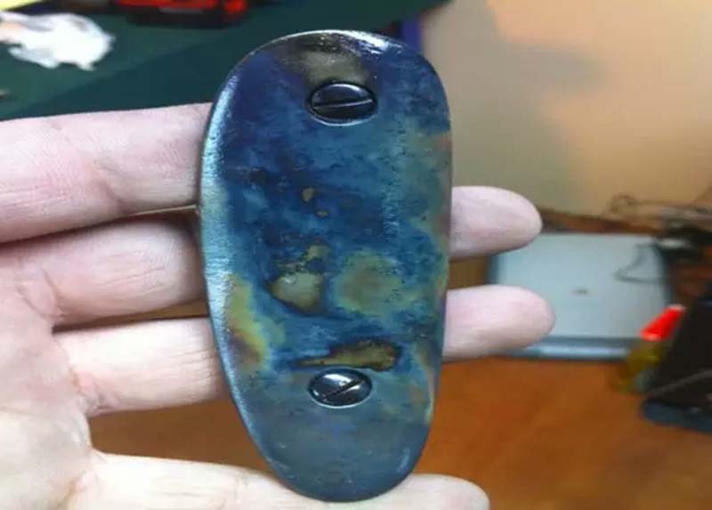 發(fā)藍(或烤藍)借助化學(xué)方式來完成:有熱、冷、熏、銹等方式,早期的槍支發(fā)藍處理采用銹發(fā)藍,這個過程是用酸溶液涂覆槍管部件,讓零件均勻生銹,然后將銹蝕處理(擦洗)掉,留下深藍色的表面。此工藝經(jīng)常需要幾天時間完成,而且是非常勞動密集型的,現(xiàn)已被主要槍械制造商放棄。