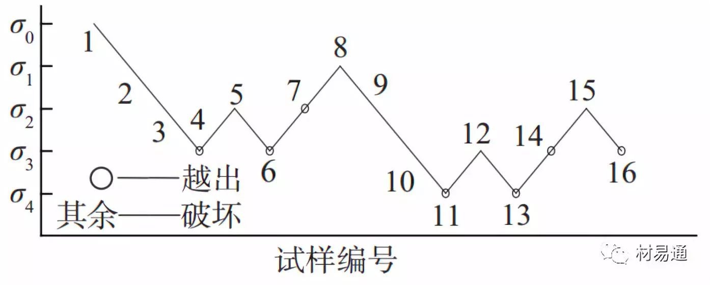試驗(yàn)方法:(1)試驗(yàn)從高于疲勞強(qiáng)度的應(yīng)力水平開始,然后逐級降低(如疲勞強(qiáng)度未知,可選用材料的靜態(tài)拉伸屈服強(qiáng)度Rp0.2或ReL);(2)在應(yīng)力水平下進(jìn)行第一根試驗(yàn),如果在指定壽命N=107次之前發(fā)生破壞,則下一根試樣就要在低一級的應(yīng)力水平下進(jìn)行,反之,則要在高一級的應(yīng)力水平下進(jìn)行,直至完成全部試樣;(3)各級應(yīng)力水平之差叫做“應(yīng)力增量”,在整個(gè)試驗(yàn)過程中,應(yīng)力增量應(yīng)保持不變。