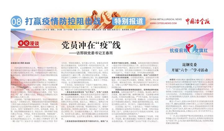 自新冠肺炎疫情發(fā)生以來,邢鋼黨員干部沖鋒在前,充分發(fā)揮基層黨組織戰(zhàn)斗堡壘作用和黨員先鋒模范作用,全力做好疫情防控各項工作,并把疫情防控作為踐行初心使命的戰(zhàn)場,團結(jié)帶領(lǐng)邢鋼全體員工迅速打響疫情防控阻擊戰(zhàn)。