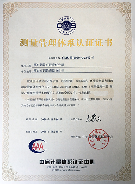 近日,邢臺(tái)鋼鐵有限責(zé)任公司(以下簡(jiǎn)稱(chēng)邢鋼)收到中啟認(rèn)證中心頒發(fā)的《測(cè)量管理體系認(rèn)證證書(shū)》,證書(shū)編號(hào)CMS冀【2020】AAA42號(hào),證書(shū)有效期至2025年11月15日,證書(shū)的獲得標(biāo)志著邢鋼測(cè)量體系認(rèn)證證書(shū)順利實(shí)現(xiàn)換版。