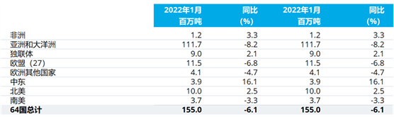 2022年1月全球64個(gè)納入世界鋼鐵協(xié)會(huì)統(tǒng)計(jì)國(guó)家的粗鋼產(chǎn)量為1.550億噸,同比下降6.1%。
