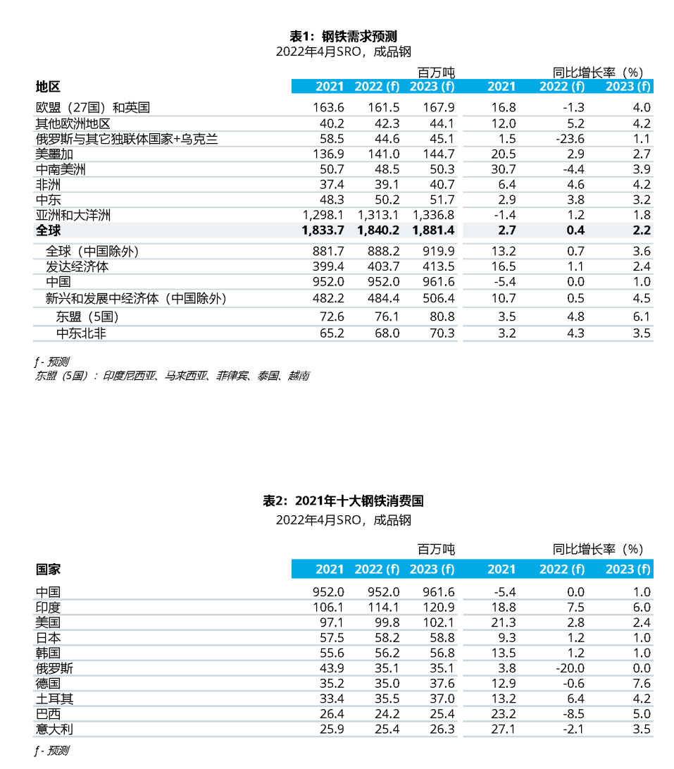 盡管出現(xiàn)零星幾輪疫情和制造業(yè)的供應(yīng)鏈限制,但在2021年鋼鐵需求仍然強(qiáng)勢復(fù)蘇,特別是在歐盟和美國。不過,由于通脹壓力,以及圍繞烏克蘭發(fā)生的事件,2022年的鋼鐵需求前景走弱。烏克蘭戰(zhàn)爭的影響在歐盟地區(qū)尤為顯著,原因在于歐盟地區(qū)對俄羅斯能源的高度依賴以及難民的涌入。在發(fā)達(dá)經(jīng)濟(jì)體,繼2021年鋼鐵需求恢復(fù)16.5%之后,預(yù)計(jì)2022年和2023年鋼鐵需求將分別增長1.1%和2.4%。