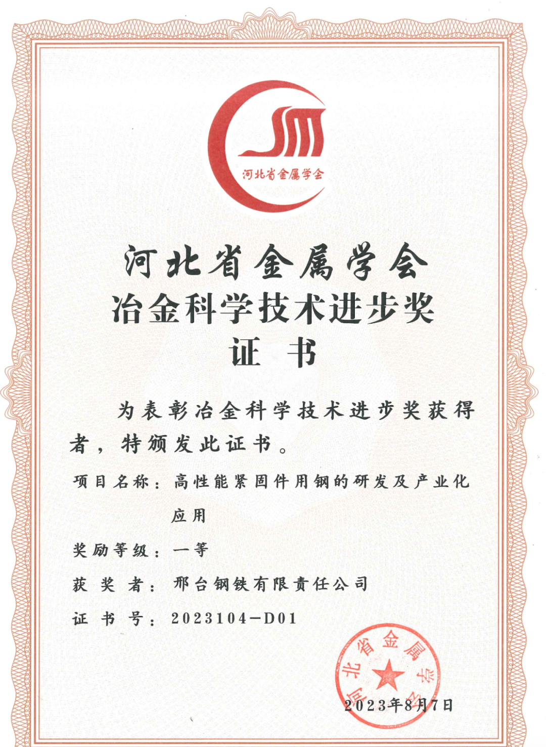 近日,邢臺鋼鐵有限責(zé)任公司兩項科技研發(fā)項目“高性能緊固件用鋼的研發(fā)及產(chǎn)業(yè)化應(yīng)用項目”“汽車底盤異形件用大規(guī)格高淬透性高潔凈度冷鐓鋼的研發(fā)及應(yīng)用”得到河北省金屬學(xué)會專家評審委員會的高度認(rèn)可,分別榮獲2023年度的 “河北冶金科學(xué)技術(shù)獎”一、二等獎。