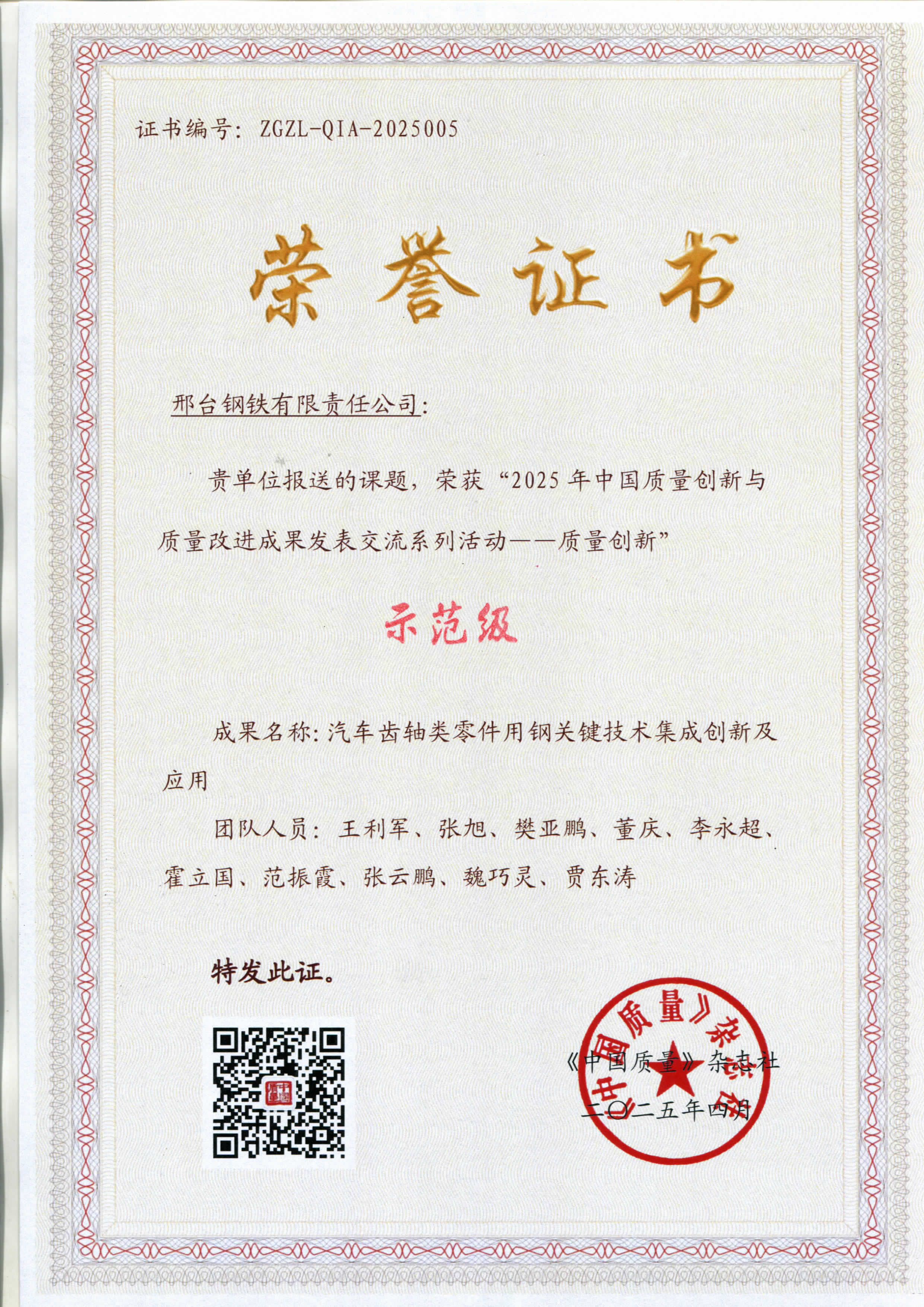 近日,由《中國(guó)質(zhì)量》雜志社主辦的“2025年中國(guó)質(zhì)量創(chuàng)新與質(zhì)量改進(jìn)成果發(fā)表交流系列活動(dòng)”在廣東省廣州市圓滿落幕。邢臺(tái)鋼鐵有限責(zé)任公司(以下簡(jiǎn)稱“邢鋼”)申報(bào)的《汽車齒軸類零件用鋼關(guān)鍵技術(shù)集成創(chuàng)新及應(yīng)用》項(xiàng)目,憑借其顯著的創(chuàng)新性、實(shí)用性和示范性,從眾多參評(píng)成果中脫穎而出,榮獲“示范級(jí)”最高獎(jiǎng)項(xiàng)。這是繼2023年高端冷鐓鋼質(zhì)量攻關(guān)項(xiàng)目、2024年新能源汽車用鋼技術(shù)創(chuàng)新項(xiàng)目之后,邢鋼連續(xù)第三年摘得該評(píng)選活動(dòng)最高獎(jiǎng)項(xiàng)。